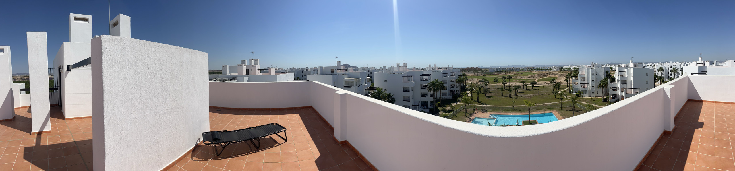Una terraza orientada al sur, con impresionantes vistas al campo de golf y la piscina, ideal para relajarse, tomar un café por la mañana o disfrutar del atardecer.